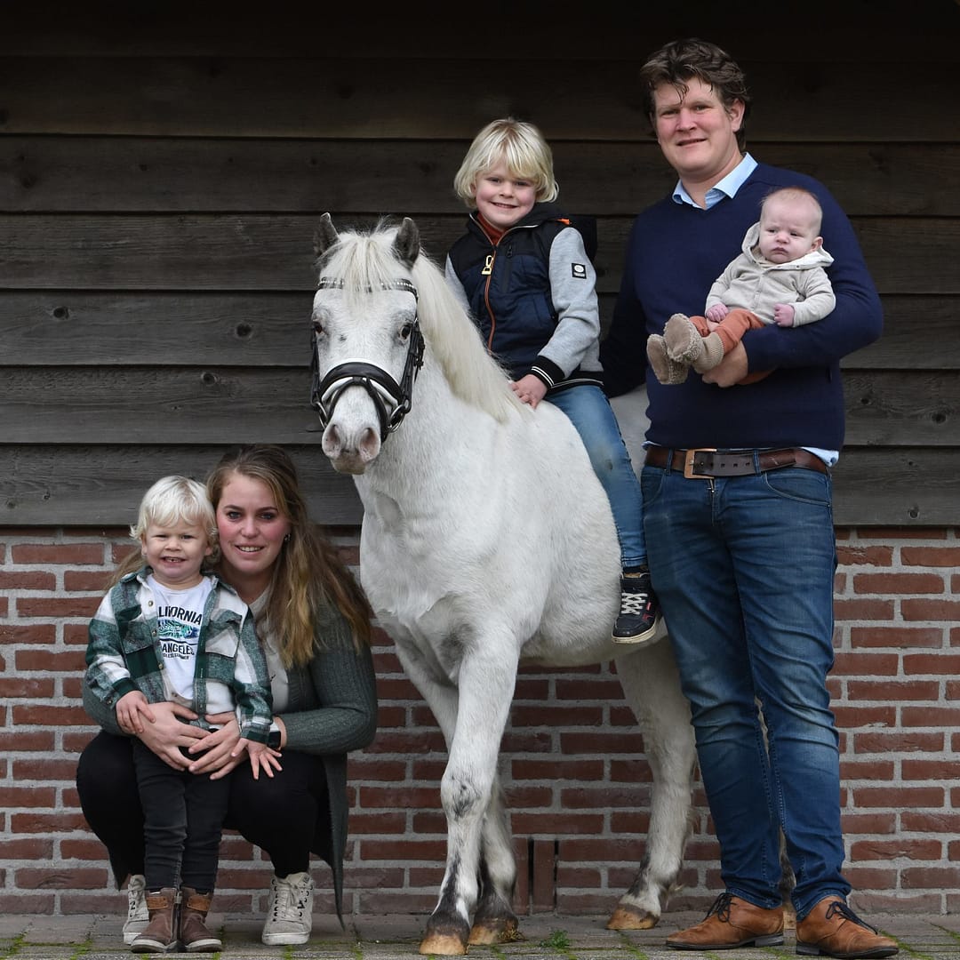 Wij zijn Joost en Estelle en samen met onze 3 kinderen Senn, Mees en Nowi wonen wij op Klein Oever. Na meer dan 15 jaar werkzaam te zijn geweest hier op het bedrijf hebben wij per september 2021 de mogelijkheid gekregen om Klein Oever over te nemen.